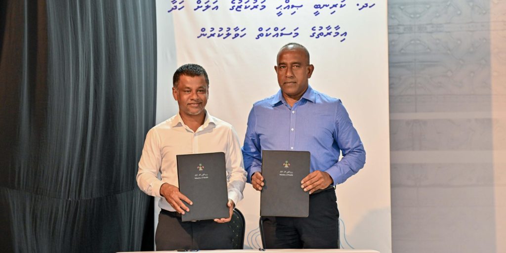 ކުރިނބީގެ ޞިއްޙީ މަރުކަޒުގެ އައު އިމާރާތުގެ މަސައްކަތް ހަވާލުކުރުމަށް ބޭއްވި ރަސްމިއްޔާތުގައިހެލްތު މިނިސްޓްރީގެ ފަރާތުން އެއްބަސްވުމުގައި ސޮއިކުރެއްވީ މިނިސްޓަރ އޮފް ހެލްތު އަބްދުﷲ ނާޘިމް އިބްރާހިމެއެވެ. އެމްޓީސީސީގެ ފަރާތުން ސޮއިކުރެއްވީ އެކުންފުނީގެ މެނޭޖިންގ ޑިރެކްޓަރ ޑ.ީސ.ީޕީ (ރޓ) އަޙްމަދު ސަޢުދީއެވެ. 300 ދުވަސް ތެރޭގައި ނިންމުމަށް ހަވާލުކުރި މިމަޝްރޫއުގެ އަގަކީ 12,533,971.48ރ. އެވެ.