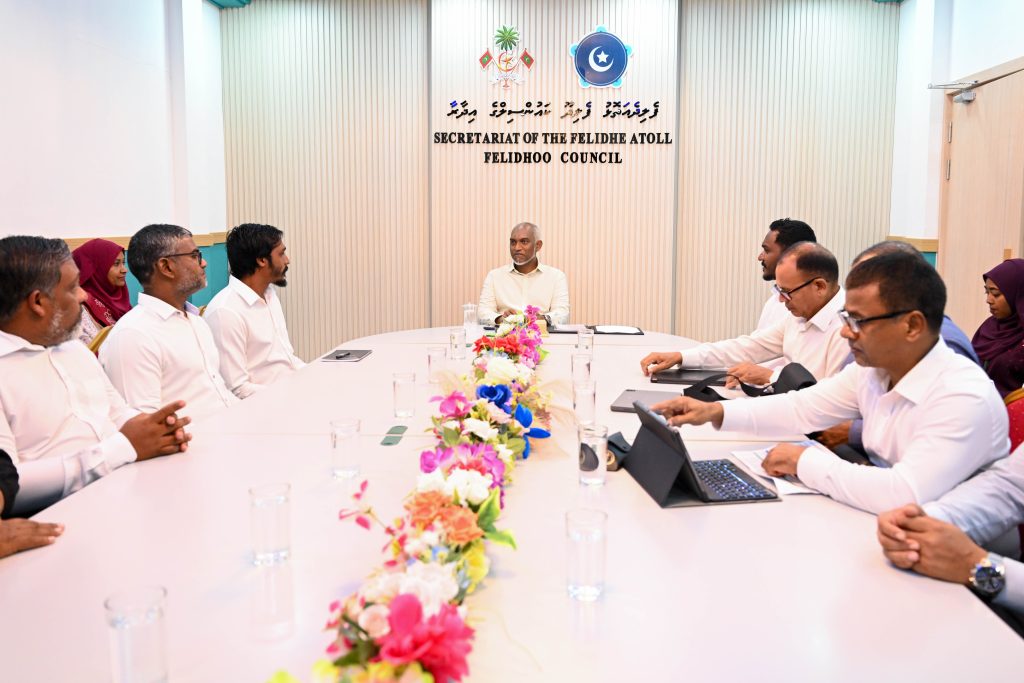 ފެލިދޫ ކައުންސިލުން މިގޮތަށް އެދުނީ، އ.ތ.މ ކޮމިޓީ އަދި ރަށުގެ ބައެއް މުއައްސަސާތަކުގެ އިސްވެރިންނާ އެކު ރައިސުލްޖުމްހުރިއްޔާ ޑރ. މުހައްމަދު މުއިއްޒު ބޭއްވެވި ބައްދަލުވުމުގަ އެވެ. ރައްޔިތުންނަށް އެންމެ މުހިންމު ކަންކަމާ ގުޅޭގޮތުން އެ ބައްދަލުވުމުގައި ވަނީ މަޝްވަރާކޮށްފަ އެވެ.