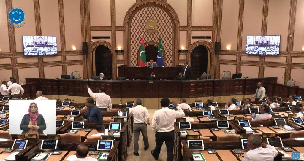 އެއާއެކު ޝަހީމްގެ ޖަވާބާ މެދު ނުރުހުންވެ ނާޒިލް ހިމެނޭ ގޮތަށް މެމްބަރުން ތަޅުމުގައި އަޑުގަދަކުރައްވަން ފެއްޓެވި އެވެ.