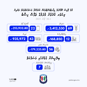 މީގެ އިތުރަށް ޖުލައި މަހު ފުލުހުން ކުރި ބައެއް މަސައްކަތްތަކުގެ ތަފާސްހިސާބުތައް ވެސް ފުލުހުން އާންމުކޮށްފައިވާއިރު ފުލުހުން ވަނީ މާލެ މަގުމަތިން 6،389 މީހުން ހުއްޓުވައި ސުވާލުކޮށްފަ އެވެ. އޭގެ ތެރޭގައި 6،145 މީހުންނަކީ ކުށުގެ ރެކޯޑު އޮތް މީހުންނެވެ. އަދި 244 މީހުންގެ އެފަދަ ރިކޯޑެއް ނެތެވެ. މިދިތަ މަހު މާލެ ސަރަހައްދުން 11 ޕޮއިންޓެއްގައި ފުލުހުން ވިސިބިލިޓީ އަދި ޓްރެފިކް މެނޭޖްމަންޓް ޕޮއިންޓް ގާއިމްކޮށްފައިވާއިރު 1196 ގަޑިއިރަށް ފައިމަގުގައި ޕެޓްރޯލްކޮށްފައިވެ އެވެ.